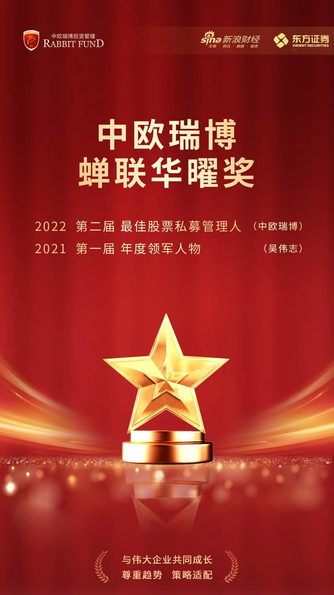 2022年9月8日,中歐瑞博榮獲由新浪財(cái)經(jīng)和東方證券共同主辦的【第二屆中國(guó)證券私募華曜獎(jiǎng)】“最佳股票策略私募管理人”獎(jiǎng)項(xiàng)。