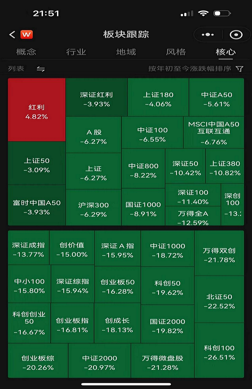 2024年的1月成了歷史上第二慘的1月,萬得全A指數(shù)單月下跌了12.59%。除了2016年的1月由于熔斷制度試錯(cuò)造成嚴(yán)重踩踏外,今年的1月A股的下跌確實(shí)相當(dāng)慘烈。由于大盤權(quán)重股受到神秘力量的支持,滬深300和上證指數(shù)的跌幅相對較小,也有-6.29%、-6.27%。代表小盤股的中證2000跌幅-20.97%,創(chuàng)業(yè)板指跌幅-16.81%,科創(chuàng)50跌幅-19.62%,北證50跌幅-22.52%,恒生科技指數(shù)跌幅-20.15%....?;旧?,除了高股息的紅利板塊成為資金避風(fēng)港和受益神秘的穩(wěn)定市場的需求仍殘留一絲暖意外,整個(gè)市場可謂寒冷徹骨。